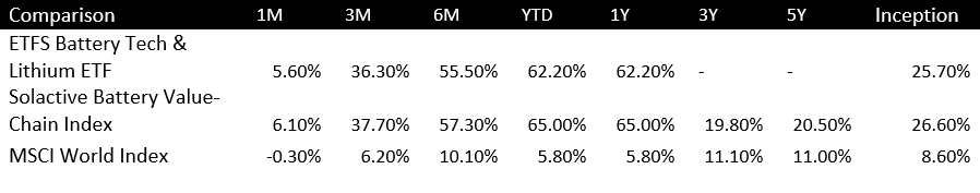 Performance has been exceptional into 2021, riding the Tesla boom but with significantly more diversification. In fact, according to ETF Securities Weekly Market Monitor, the 12-month return of ACDC to the 5th of February was 59.6 per cent, placing it third of all ASX-listed ETFs.