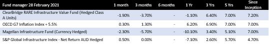 One of the most important considerations for investors is fees, with both broadly similar, around 1%, in line with the global average and reflecting the significant research required to navigate the sector. That said, Magellan also charges a performance fee of 10% of outperformance over the higher of the S&P Global Infrastructure Index and the 10-year Australian government bond yield, which is currently around 1.60%.