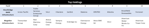 Not surprisingly, given the concentration of the sector, there are a few overlapping holdings within the top tens, including energy construction group Vinci, but the holdings differentiate quickly after that. Where Magellan holds its largest exposure in toll roads (17%) and integrated power (16%), ClearBridge is focused on electricity distribution (33%) and railroads (12%).
