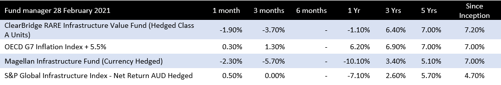 As at the end of February, the fund returned -1.9% for the month, lagging the MSCI AC World Index which returned 2.40%. Over the year the fund lost just 1.1% in value, which was better than the S&P Global Infrastructure Index which lost 7.1%, but much worse than the MSCI AC World Index’s return of 27.2%.
