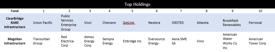 Not surprisingly given the concentration of the sector, there are a few overlapping holdings within the top 10, including energy construction group Vinci, but it differentiates quickly after that. Where Magellan holds its largest exposure in the toll roads (17%) and integrated power sectors (16%), ClearBridge is more focused on electricity distribution (33%) and railroads (12%).