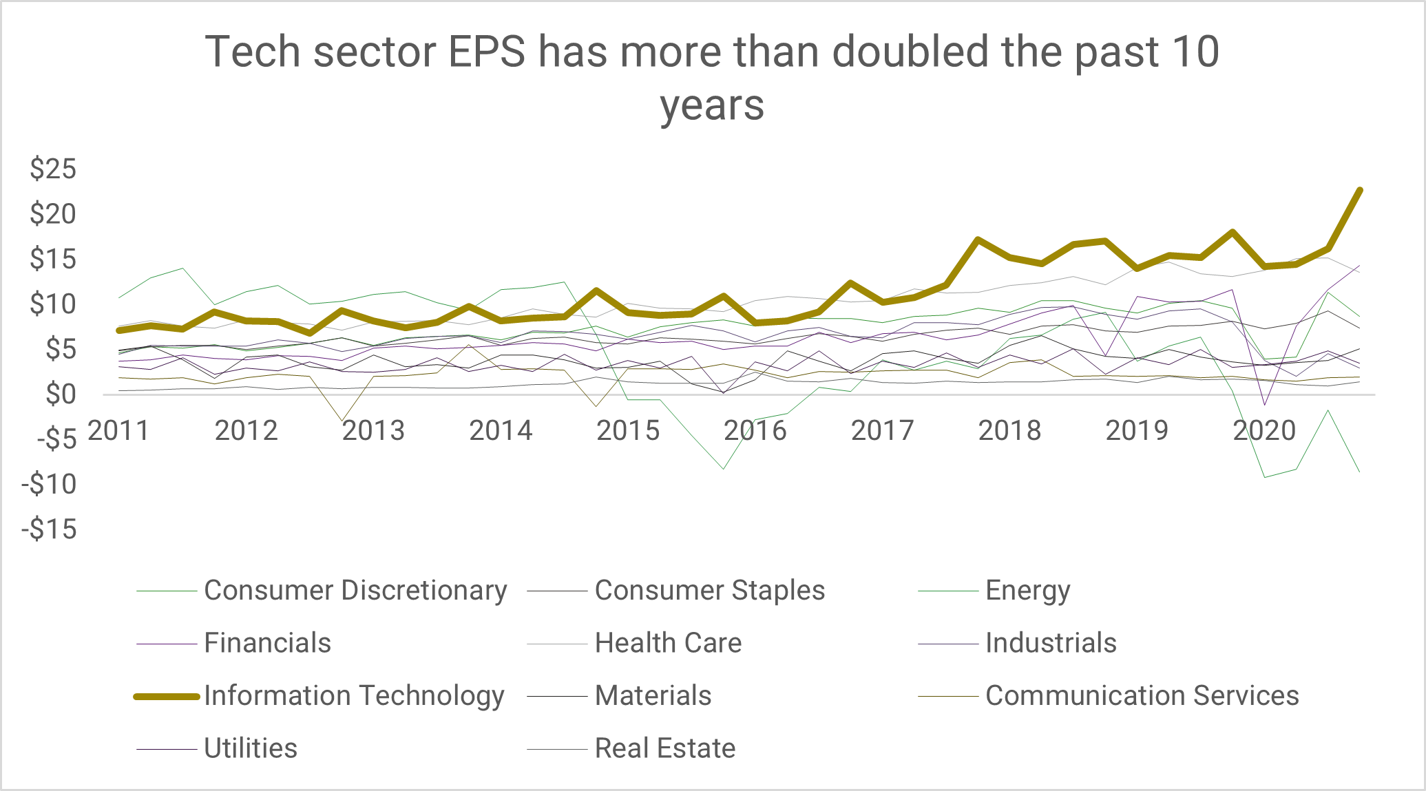 The past decade, the tech sector saw its profits – as measured by earnings per share (EPS) – swell more than any other sector. Making matters better for tech, the rate of profit growth was also the highest of any sector, according to data from S&P Global.