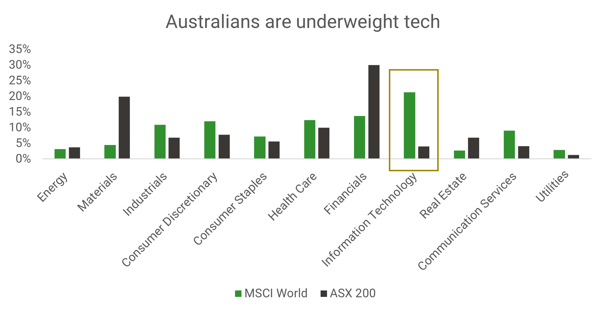 For all the success of the tech sector, Australians have mostly sat the rally out. The Australian share market has only a very small tech sector: technology companies make up just 4% of the ASX 200. The Australian share market is instead dominated by the banks and miners – with the financials and materials sector taking 50% of the ASX 200. Putting this is in perspective, the MSCI World – which measures the total global share market – is made up 21% of technology companies. Financials and materials together get just 19%.