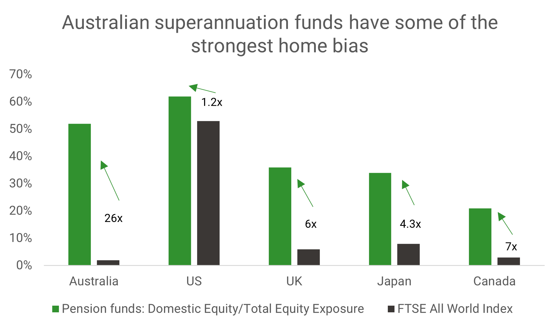 Australians often stay under-exposed to technology companies due to their reluctance to invest overseas. According to a review from FTSE Russell, Australians’ have a strong preference to invest at home. On average, Australians put just 47% of their portfolios into foreign assets. This comes despite the Australian share market making up just 2% of the global share market. This implies a preference for staying home – or “home bias” – of 26 times[1]. Home bias exists in other countries, too. But usually to a smaller extent. For instance, home bias is roughly 1.2 times in the US and roughly 6 times in the UK.