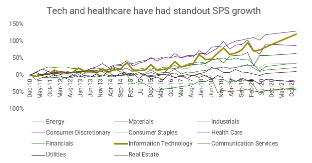 These results are more remarkable when one considers that several sectors – particularly energy, materials, real estate – saw no EPS growth at all over that period.