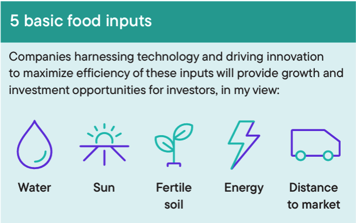 I am not an expert on climate change. Therefore, I will leave it to those experts and environmental, social and governance (ESG) specialists to talk in detail about the impacts of climate change on our food system and which government policies are required to address or decrease impacts. I am looking at the future of food and the innovation and technology that will be needed to safely produce and distribute the food we need from the perspective of an investor. That said, it is clear the food system—which makes up 10% of the global economy5— is increasingly a major driver of climate change, and at the same time is disrupted by climate change. This disruption will impact global investors across asset classes—in equities alone, food makes up US$4.9 trillion or approximately 4% of global market capitalization.6 So, it’s critical that we think about how investors respond—whether they focus on ESG or not—to identify opportunities in the market and potentially avoid risk that could materially impact their portfolios.