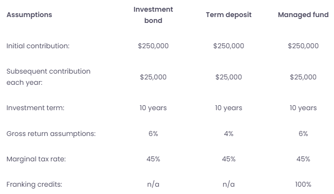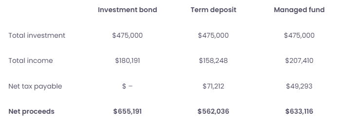 Foresters gave the example of a $250,000 initial investment, with a subsequent annual contribution of $25,000 (worth noting is that the bond holder can only invest up to 125 per cent of the previous year’s contribution). They then compared the returns of a comparable investment under the same terms directed towards a managed fund and a term deposit.