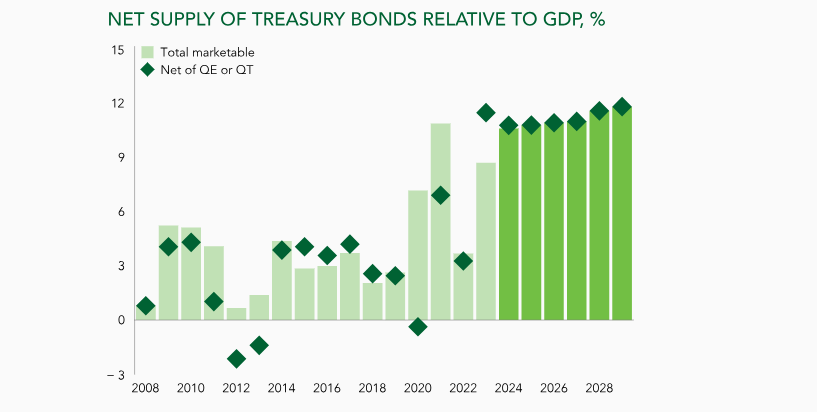 To be clear, these estimates do not include the fiscal promises Donald Trump made in the run up to the election. These are estimated to add $7.8 trillion to federal debt over the next decade – roughly a 25 per cent increase on current projections, even after including $2.7 trillion of additional revenue raised via import tariffs – a highly questionable revenue source. Unless Donald Trump reneges on his key campaign pledges, the supply of government bonds hitting the market in the years ahead will be even greater than the chart suggests.