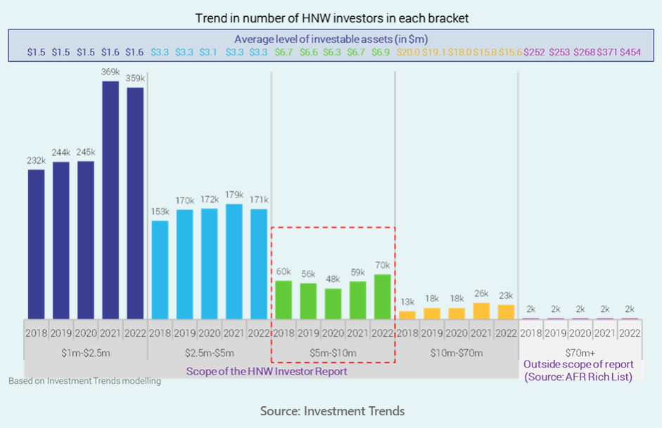 The report, which aims to provide an in-depth look at Australian HNW investing behaviour and investors’ product and advice needs, “highlights that as we come out of a period of unprecedented asset value growth” reflected in the lower overall HNW population, “the total level of investable assets held steady”, Investment Trends notes. This investor class is also showing to be reactive to the changing macroeconomic outlook, which may underpin its resilience.