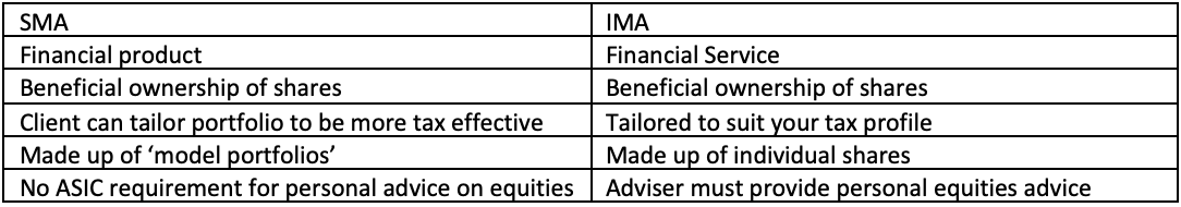 - The first is a separately managed account (SMA). An SMA is a financial product: each investor gets the same portfolio. It’s almost like a managed fund but the advantage is that each client can see each individual portfolio holding.