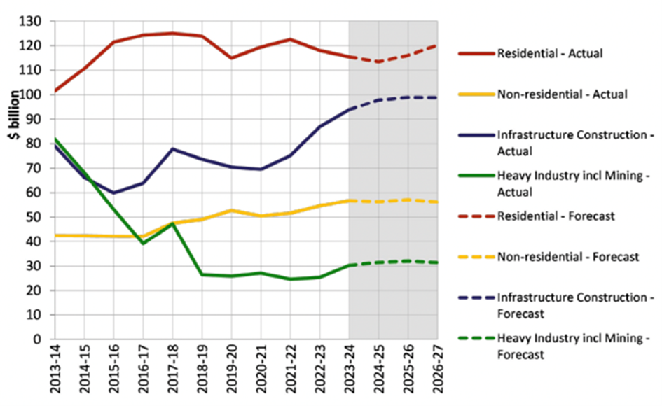 Chart: Australian building and construction work done ($bn, 2021-22 prices)