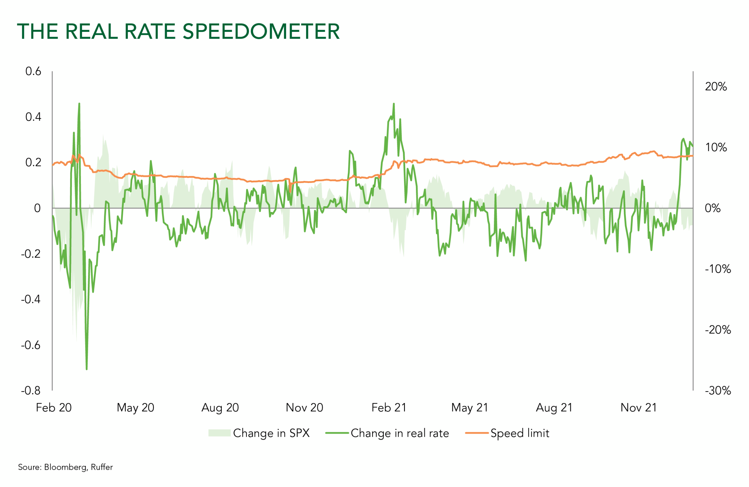 At Ruffer, we compare how fast a medium-term measure of real rates is rising relative to how fast derivatives markets expect them to move – the speed limit. We know that, once real rates speed up, there is a higher probability of equity markets selling off and rotating out of growth stocks and into value stocks. Once real rates exceed the speed limit, the chances of an accident are high.