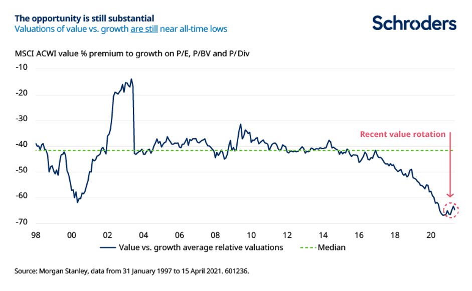 The small bounce seen in the red dotted circle is what has occurred since October, which is barely visible at the end of the chart. While the recent moves feel spectacular to many, Schroders thinks we’re looking at a tremor of performance rather than a real earthquake. “If valuation gaps in the market are to return to something more like normal in the context of long-term history, there seems to be a long way to go,” says Adler.